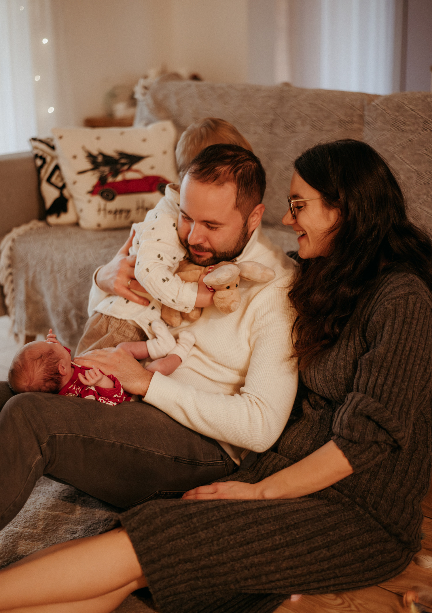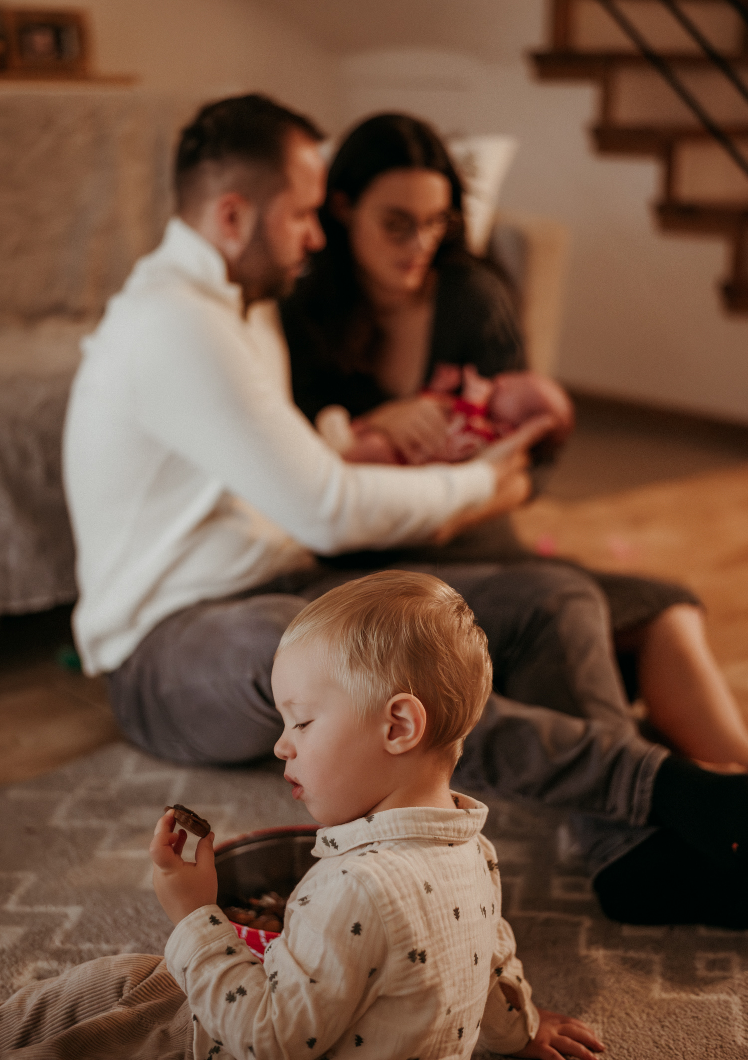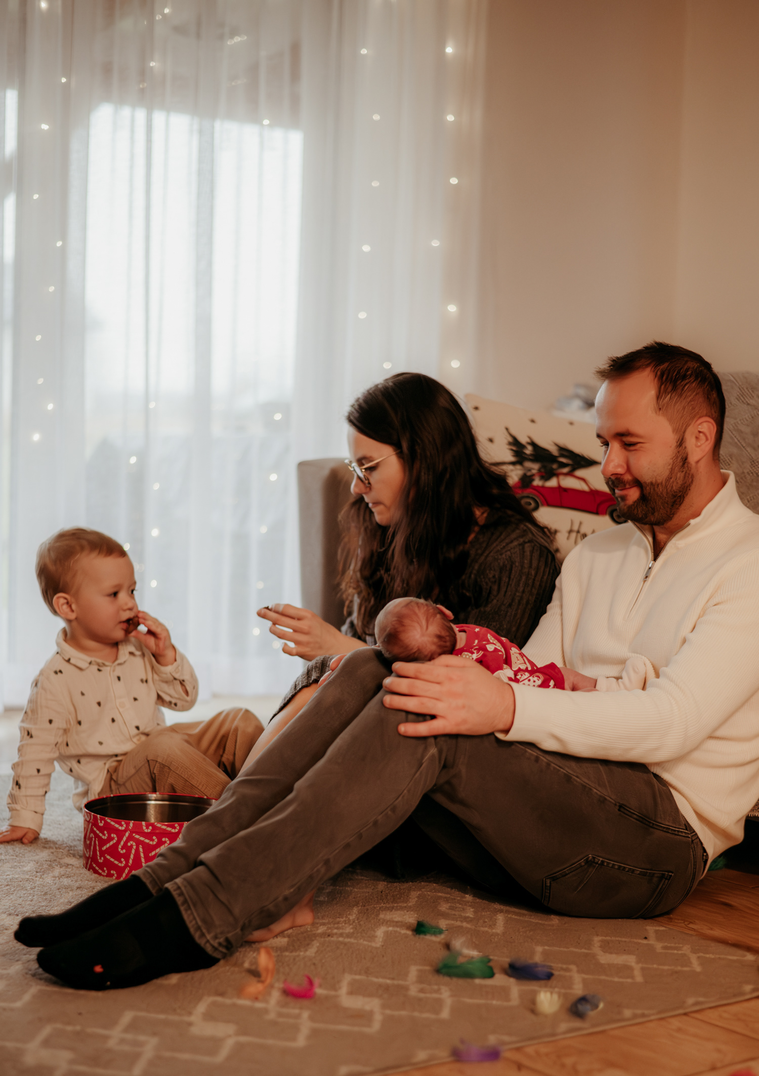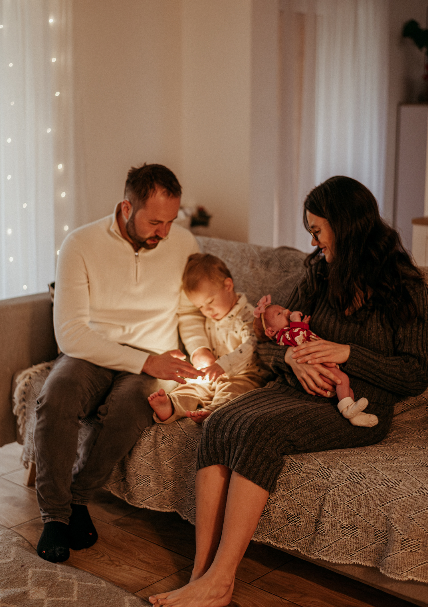 Ta domowa sesja noworodkowa odbyła się w świątecznym klimacie, w Tarnowskich Górach. W rolach głównych: malutka dziewczynka, starszy brat i rodzice. Było ciepło, przytulnie i naturalnie mimo mroku za oknem – bez pozowania i bez stresu. W rytmie dzieci. W sesjach rodzinnych w stylu lifestyle najważniejsze jest to, żeby każdy czuł się dobrze. Nie trzeba się uśmiechać na zawołanie – można czytać książkę, jeść pierniki, tulić noworodka, po prostu być razem. Takie sesje to zapis codziennych, prawdziwych chwil – i właśnie za to je kocham.
